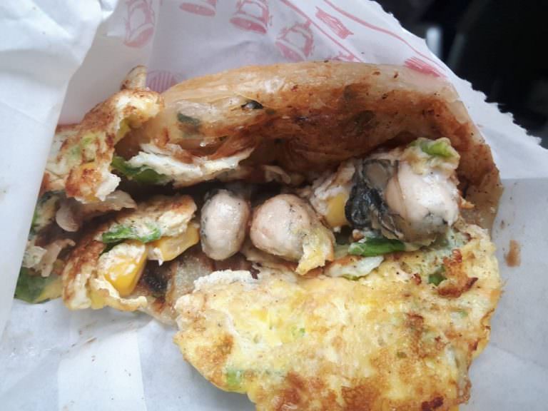 蔥抓餅的外皮酥脆,內部層次豐富,口感柔勁,一口咬下,麵粉與青蔥的香味在在口中融為一體,再搭配滿滿肥美鮮蚵,咕滑爽脆口感在口中爆開,讓人回味再三。