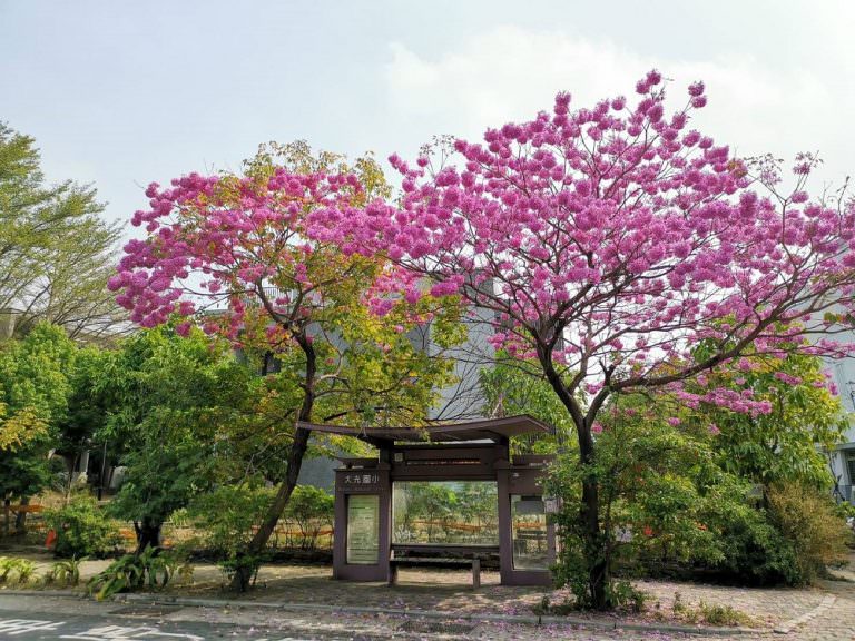 台南大光國小側門北門路段上,風鈴木正在盛開,爆炸的粉紅花朵,宛如櫻花滿樹綻放、顏色相當繽紛,美得好療癒。